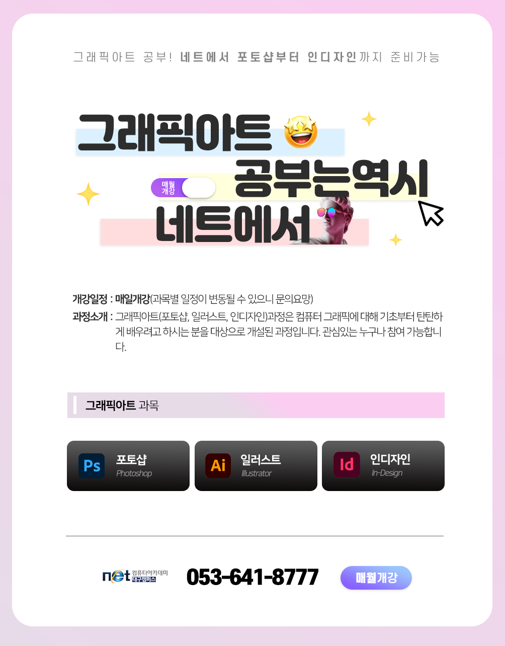 교육센터 소개/공지사항 [소식] 포토샵부터 인디자인까지 다 담았다! 그래픽아트 디자인과정 작성자 : 교무행정팀 작성일 : 2022. 6. 2. 21:00 원클릭 간편 수강문의 희망하시는 과정과 문의내용을 작성해주시면 빠른 수강문의가 가능합니다 공유하기 게시글 관리 네트컴퓨터아카데미학원 대구점 목록 [초격차] 예약쿠폰 최대 10% 단독제공! 🎯테마강의 마감주의 👆🏻 바로가기 교육부터 1:1 멘토링+인턴쉽 기회까지😎 지금바로 신청해봐! 티스토리툴바