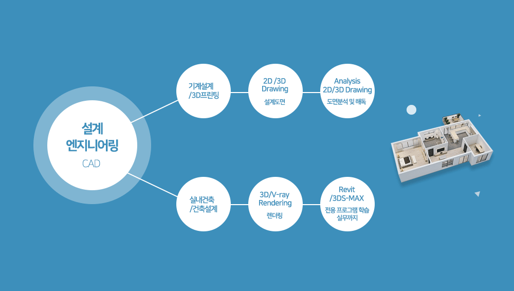 프로그램 사용법부터 3D설계, 응용과정(실무분야)까지 전·현직 최고수준 강사진과 학습가능합니다.