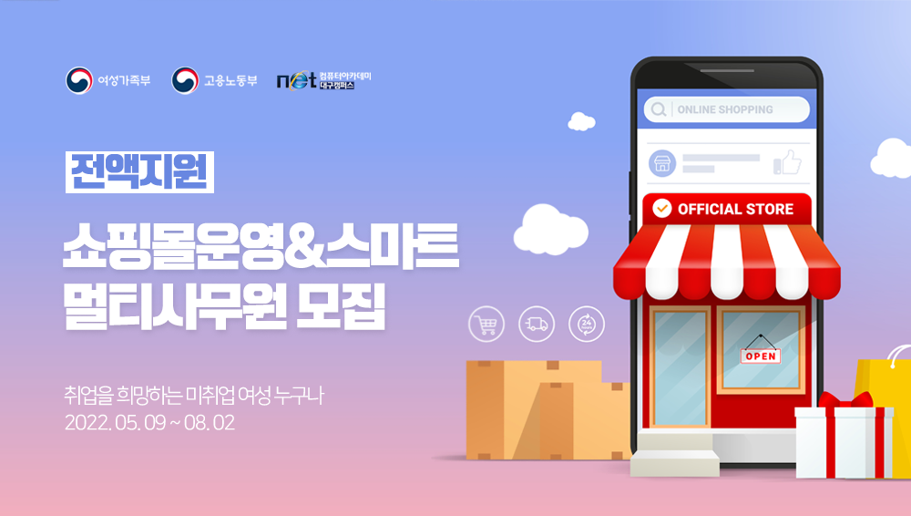 여성가족부와 네트컴퓨터아카데미학원이 뭉쳤다! 여성가족부가 주최하고 네트가 주관하는 쇼핑몰운영&스마트멀티사무원
