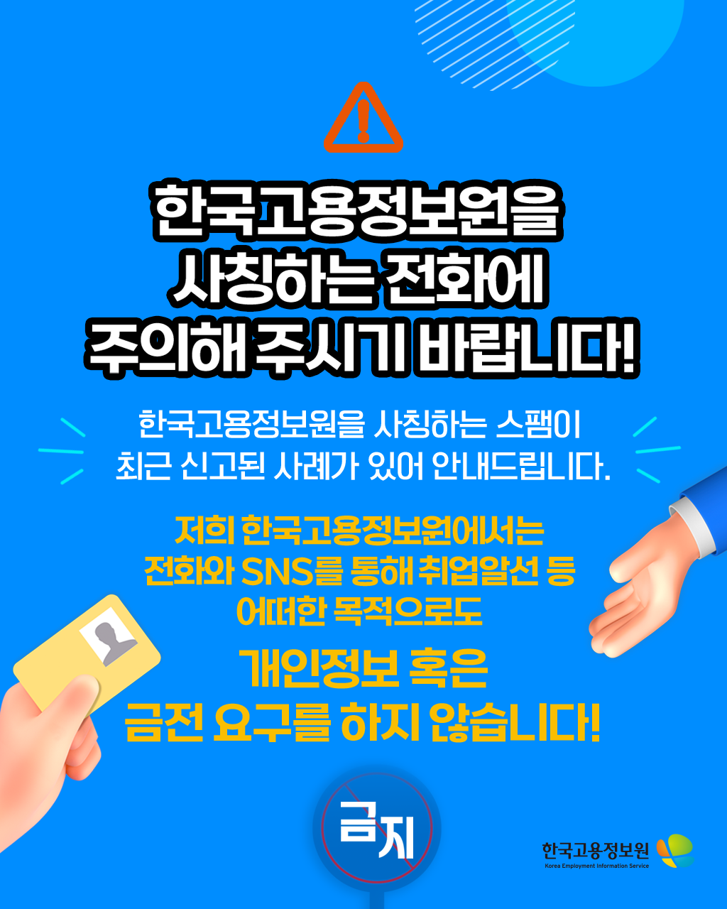 최근 고용노동부 위탁집행형 준정부기관인 한국고용정보원을 사칭하는 전화 등 스팸신고 사례가 접수되어 우리 교육기관 교육훈련생 및 수료생 여러분께 유의사항으로 전달드리오니 이 점 참고 바랍니다.