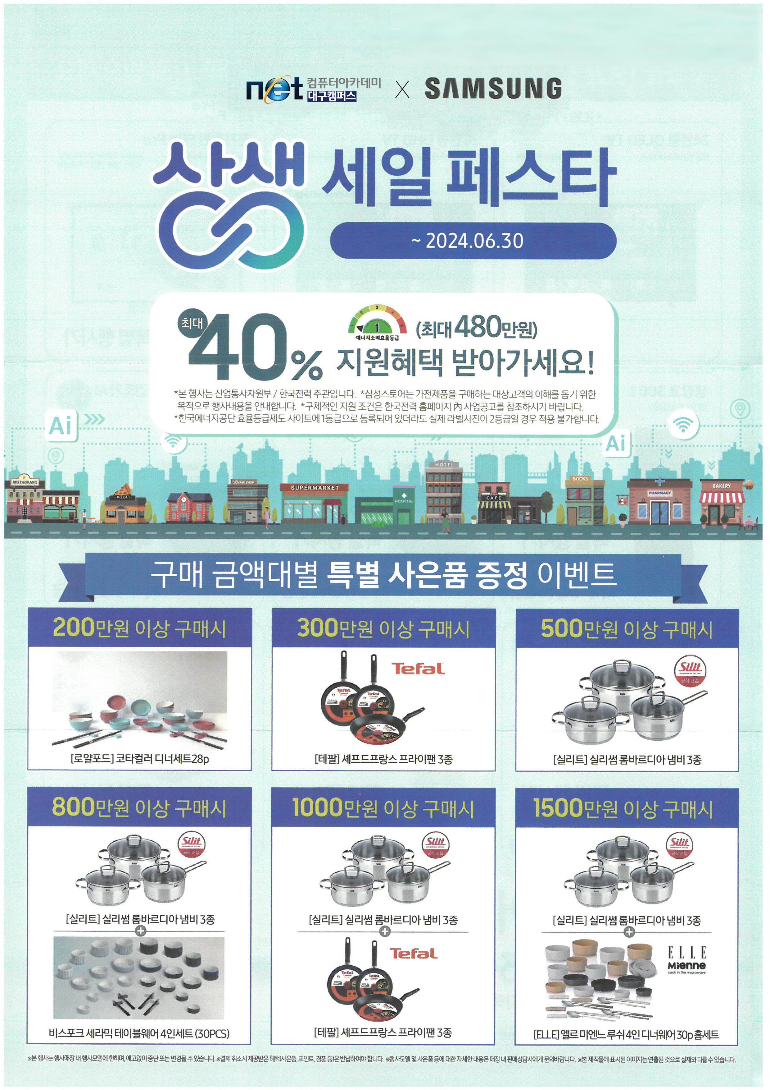 삼성디지털프라자 상인점에서 상생 세일 페스타로 최대 40%(최대 480만원) 전자기기 지원혜택을 실시하고 있습니다. 우리 교육기관(이하 네트컴퓨터아카데미 대구캠퍼스) 수강생 및 수료생이라면 누구나 본 상생 세일 페스타에 참여가능하오니 많은 관심 부탁드립니다.