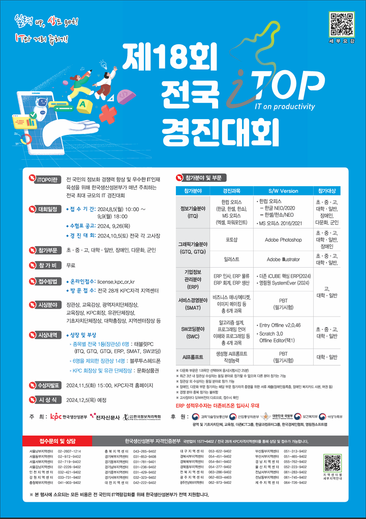 전 국민의 정보화 경쟁력 향상과 우수한 IT인재 육성을 위해 실시되는 제18회 i-TOP 경진대회가 개최됩니다. 본 경진대회는 대한민국 최대 IT분야 협의체인 한국생산성본부가 주최하며 9월 실시될 예정으로 우리 교육기관 교육훈련생 및 수료생, 학부모 여러분의 많은 관심과 성원 부탁드립니다.