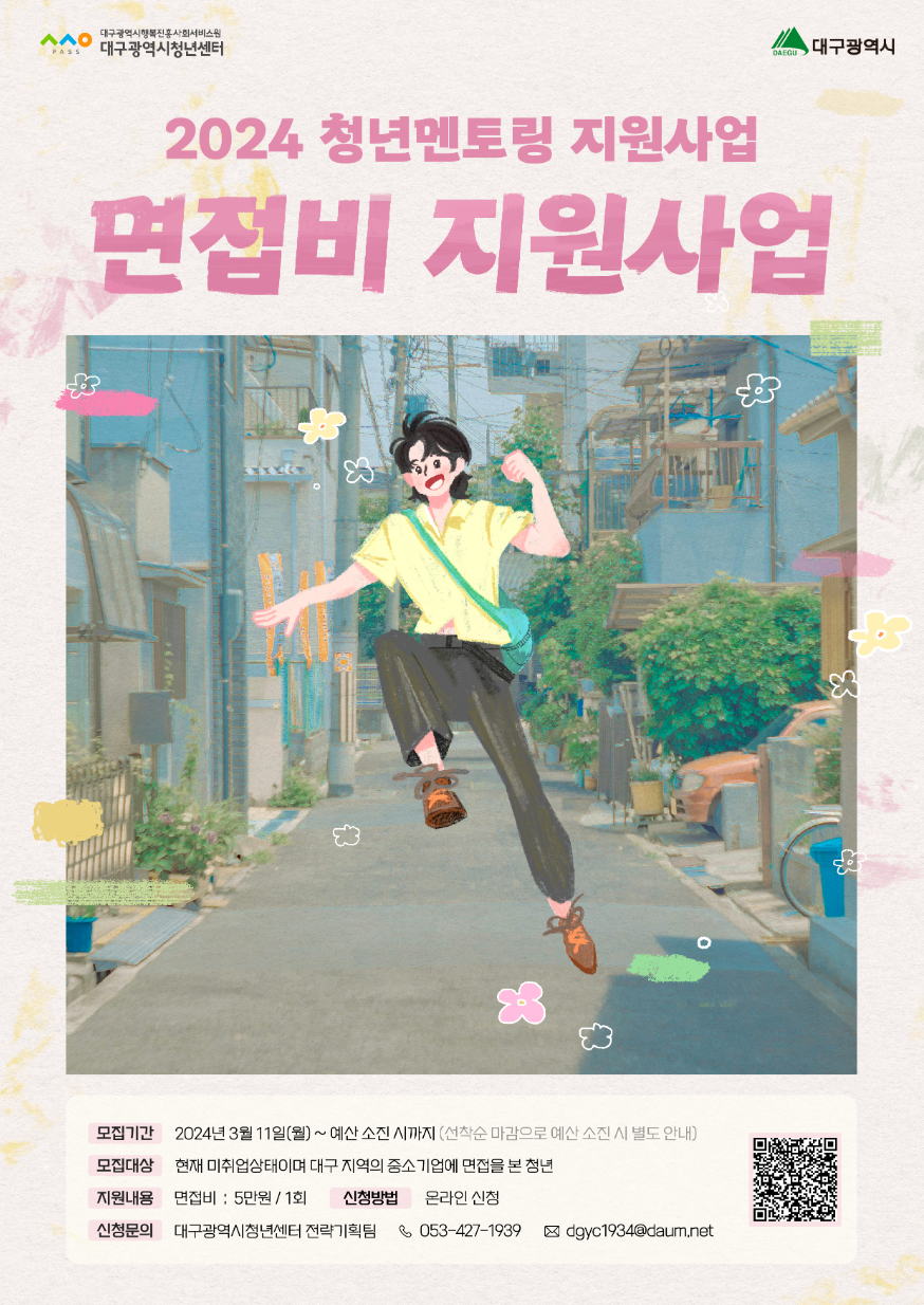 청년이라면 누구나! 취업을 위해 오늘도 고군분투하는 면접자라면 참여가능한 면접비 지원사업에 여러분을 초대합니다. 본 사업은 현재 미취업상태이며 대구지역 내 소재한 기업체(중소기업)에 면접을 본 청년이라면 누구나 받을 수 있는 면접비 지원사업에 많은 관심과 참여 바랍니다.