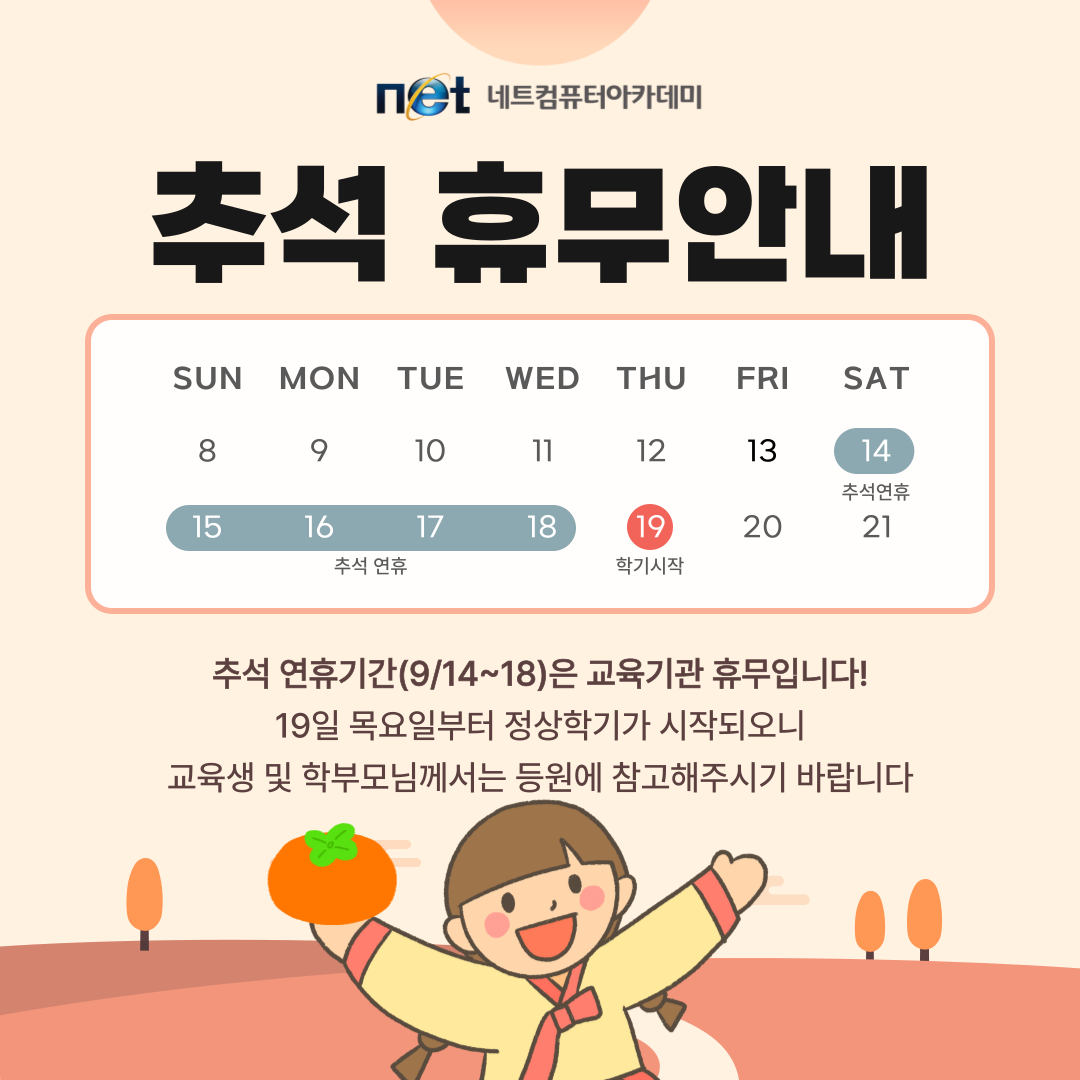 추석 연휴기간과 주말은 교육기관(아카데미) 휴무입니다. 명절 연휴기간 중에는 교육기관(아카데미)은 미운영되며 9월 19일(목)부터 정상학기 및 행정처리가 정상 재개되오니 교육기관을 이용하는 학부모 및 교육훈련생 여러분께서는 참고해주시기 바랍니다.