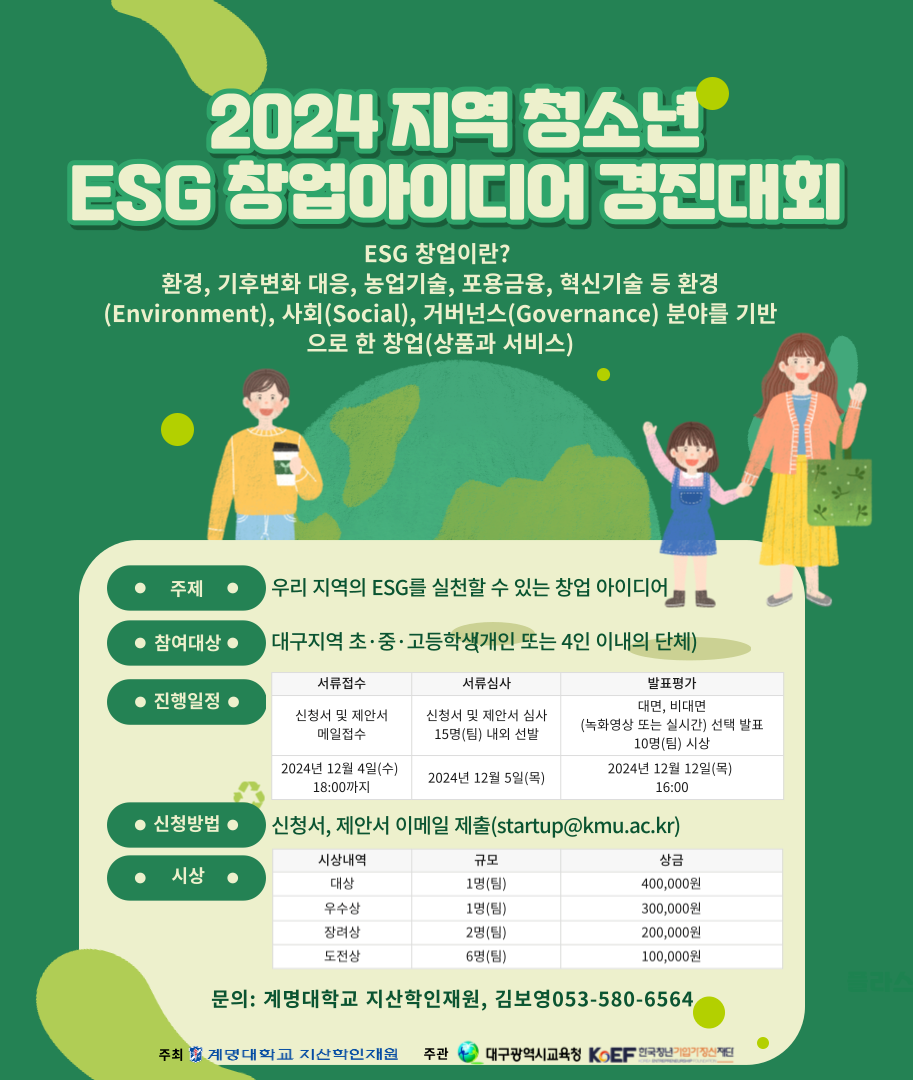 계명대학교, 대구광역시교육청, KOEF에서 2024 지역 청소년 ESG 창업아이디어 경진대회를 개최합니다.
