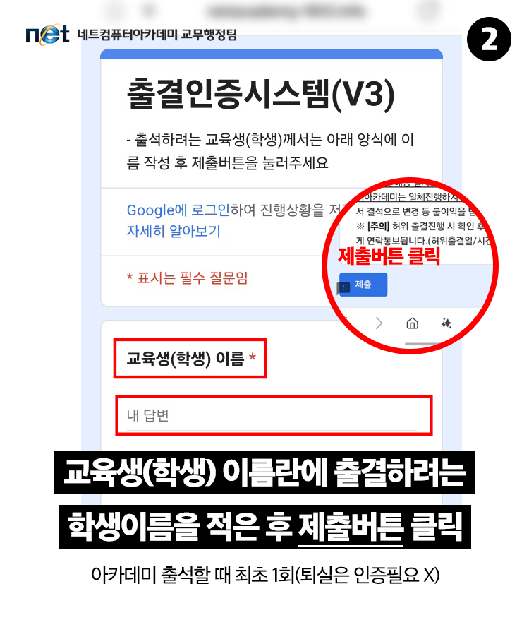 3. [주의] 허위 출결진행 시 교직원·담임교사 확인 후 학부모님에게 연락통보됩니다. (허위출결일/시간 등)