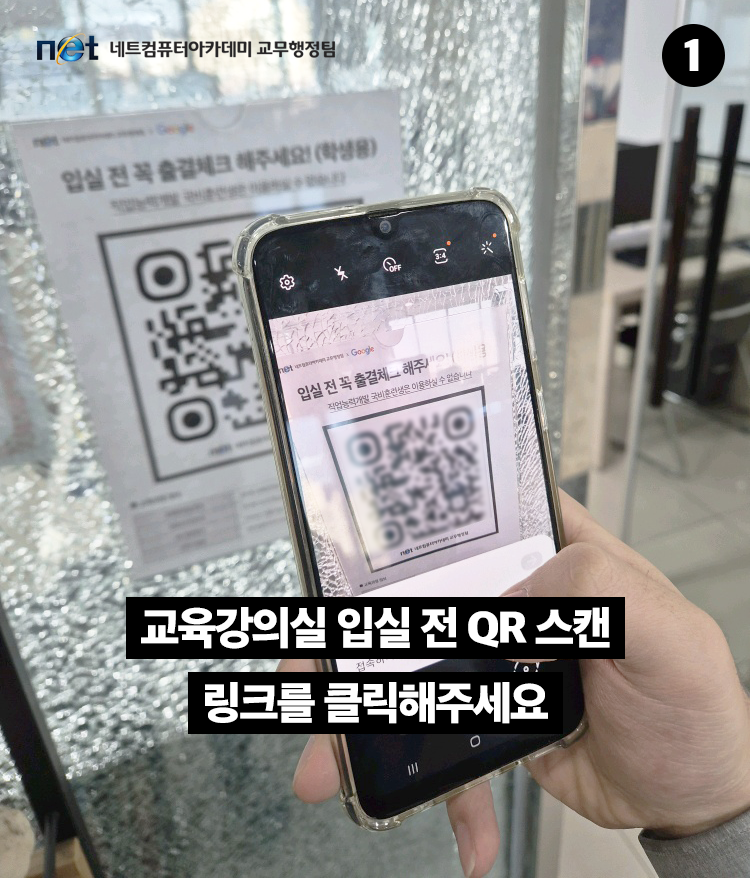 1월 13일부터 우리 교육기관(이하 네트컴퓨터아카데미)에서 실시되는 정규과정 교육강의실 QR 출석체크가 각 강의실별 시행됩니다. 교육수강 중인 교육생(학생)께서는 이용방법을 위와 같이 참고하시어 출결인증해주시기 바랍니다.
