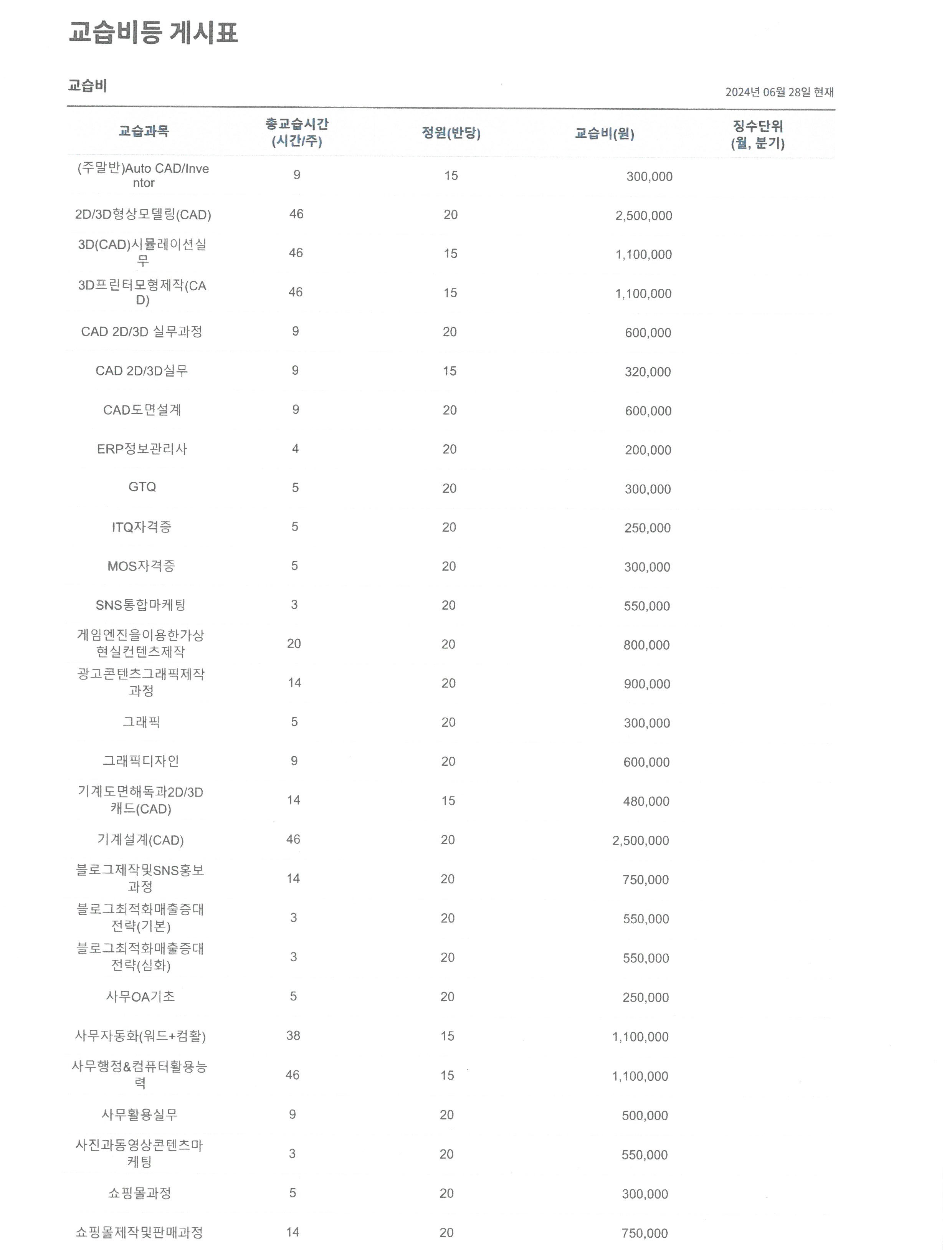 네트컴퓨터아카데미학원에서 운영 중인 수강료 게시표(교습비 등 게시표)입니다.