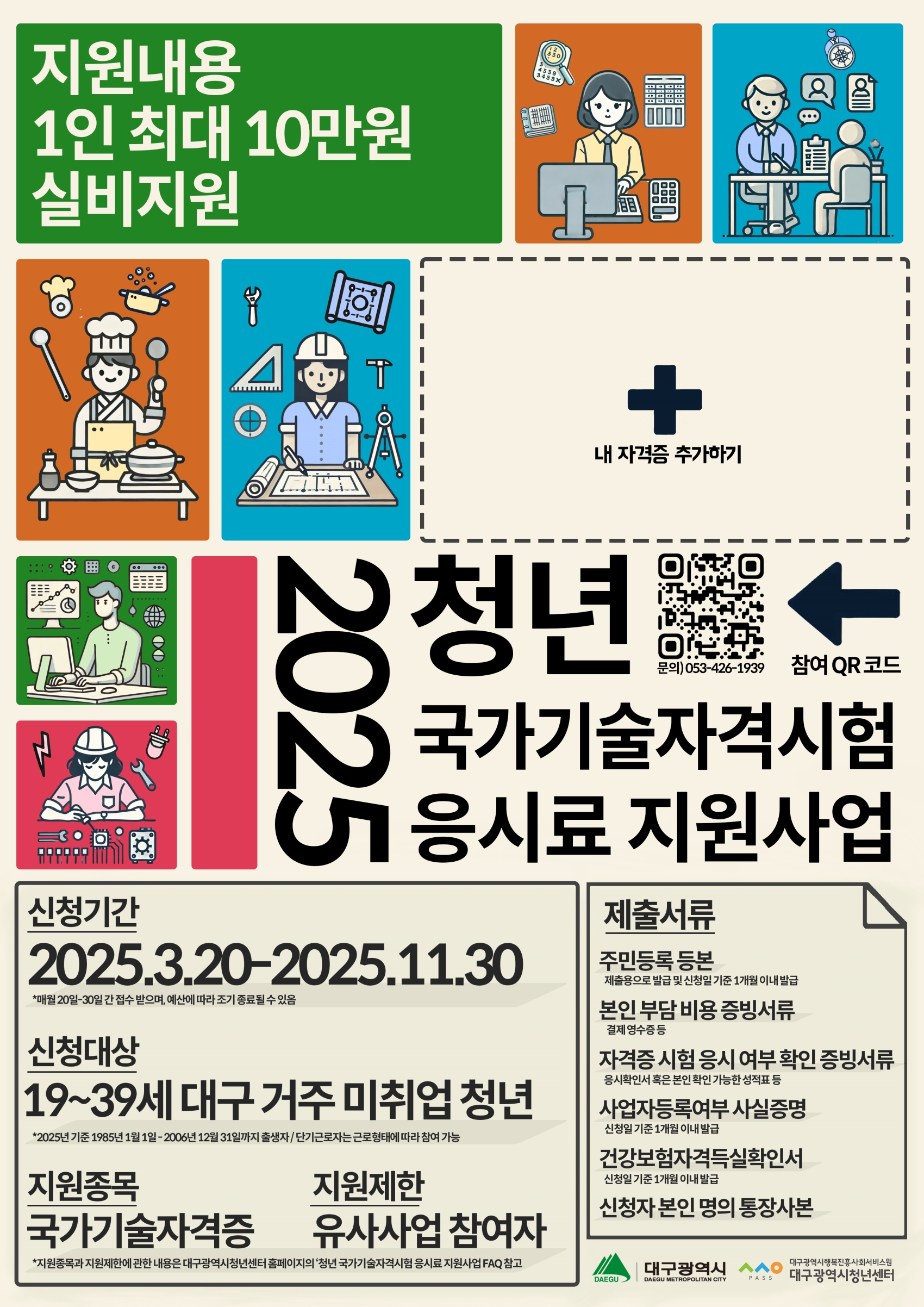 대구광역시에서는 청년들의 취업경쟁력 향상과 경제적 부담 완화를 위해 「2025 청년 국가기술자격시험 응시료 지원사업」을 다음과 같이 시행하오니 우리 교육기관에 재학중인 교육훈련생 및 수료생께서는 많은 신청 바랍니다.