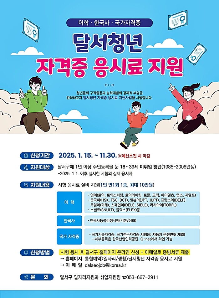 대구광역시 달서구청에서는 청년들의 취업경쟁력 향상과 경제적 부담 완화를 위해 「달서청년 자격증 응시료 지원사업」을 다음과 같이 시행하오니 우리 교육기관에 재학중인 교육훈련생 및 수료생께서는 많은 신청 바랍니다.