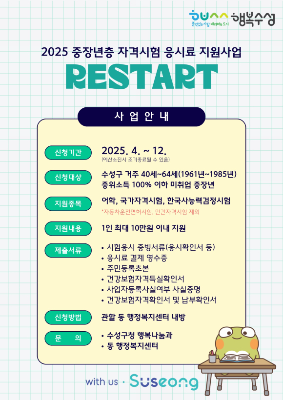 대구광역시 수성구청에서는 중장년층의 취업경쟁력 향상과 경제적 부담 완화를 위해 「2025 중장년층 자격시험 응시료 지원사업」을 다음과 같이 시행하오니 우리 교육기관에 재학중인 교육훈련생 및 수료생께서는 많은 신청 바랍니다.