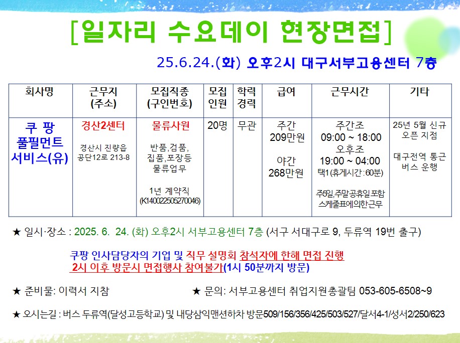 - 면접장소 : 대구서부고용센터 7층 면접장 / 이력서 지참 방문 /고용24구직신청 필수