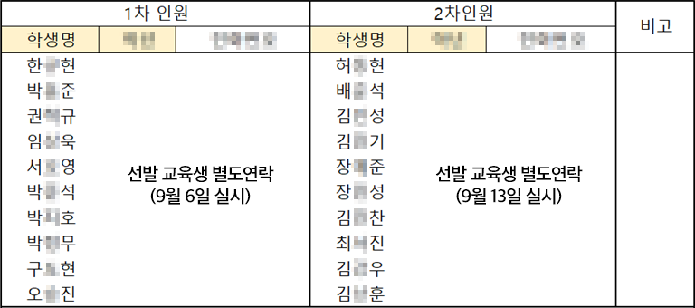 안녕하세요, 네트컴퓨터아카데미학원 교무행정팀입니다. 반도체 특화체험활동 선발 교육생 명단을 다음과 같이 공지합니다. 본 특화체험활동 명단에 선발된 교육생에 한하여 문자메세지 등으로 일정안내를 공지할 예정입니다.