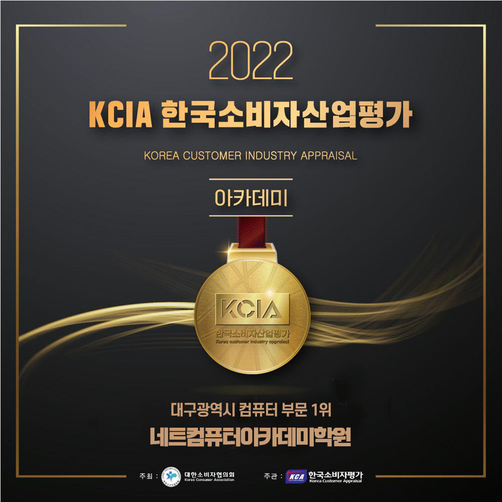 네트컴퓨터아카데미학원은 대한소비자협의회가 주최하고 한국소비자평가가 주관하는 <2022 KCIA 한국소비자산업평가 "아카데미"> 부문에서 대구광역시 지역평가 1위를 수상하였습니다.
