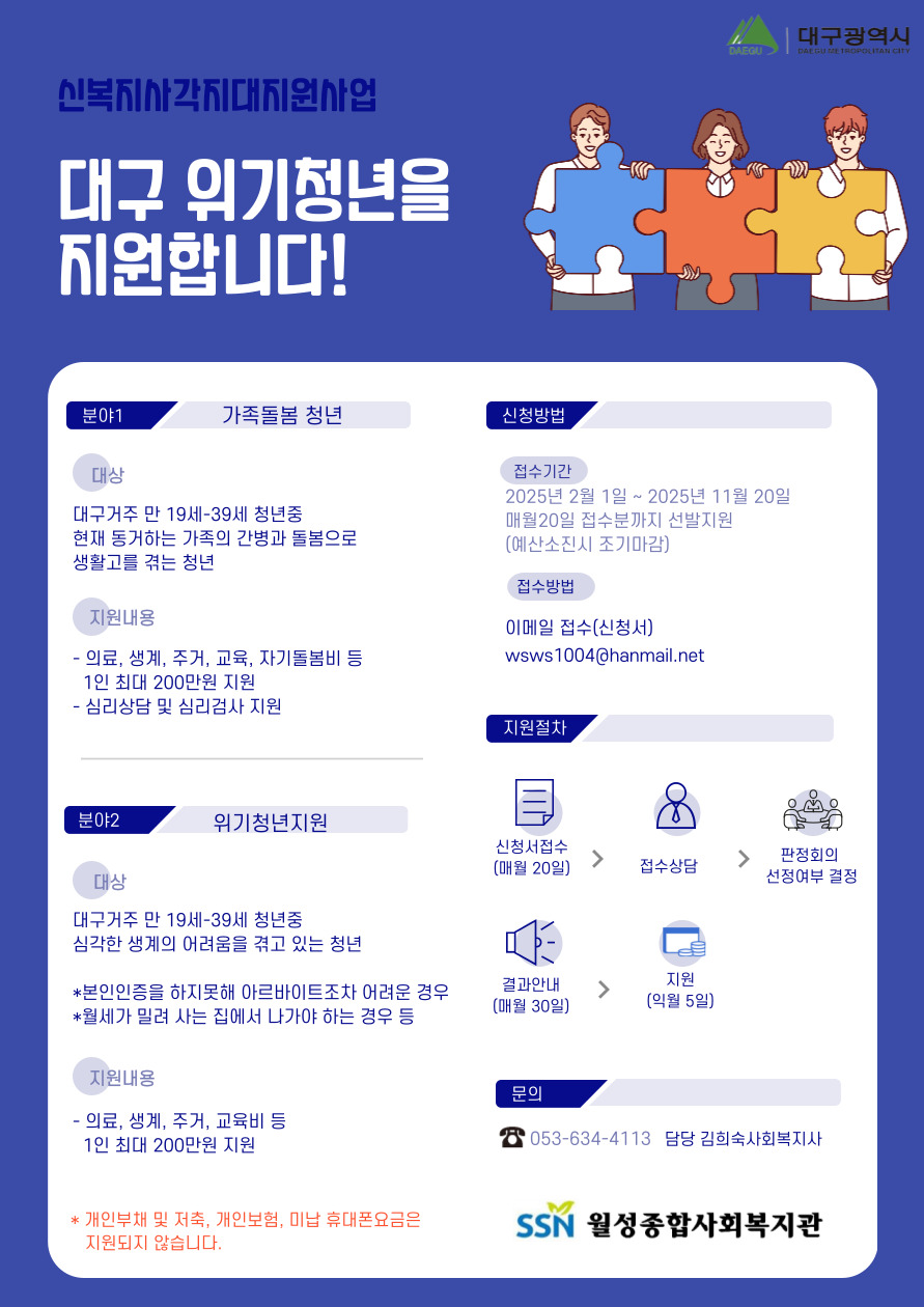 ✅ 지원대상 : 대구거주 만 19세~39세 청년 중 심각한 생계의 어려움을 겪고 있는 청년
