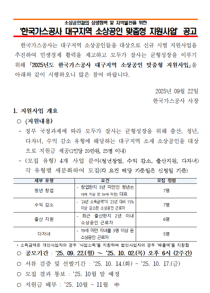 ○ 공 모 명 : 「2025년도 한국가스공사 대구지역 소상공인 맞춤형 지원사업」