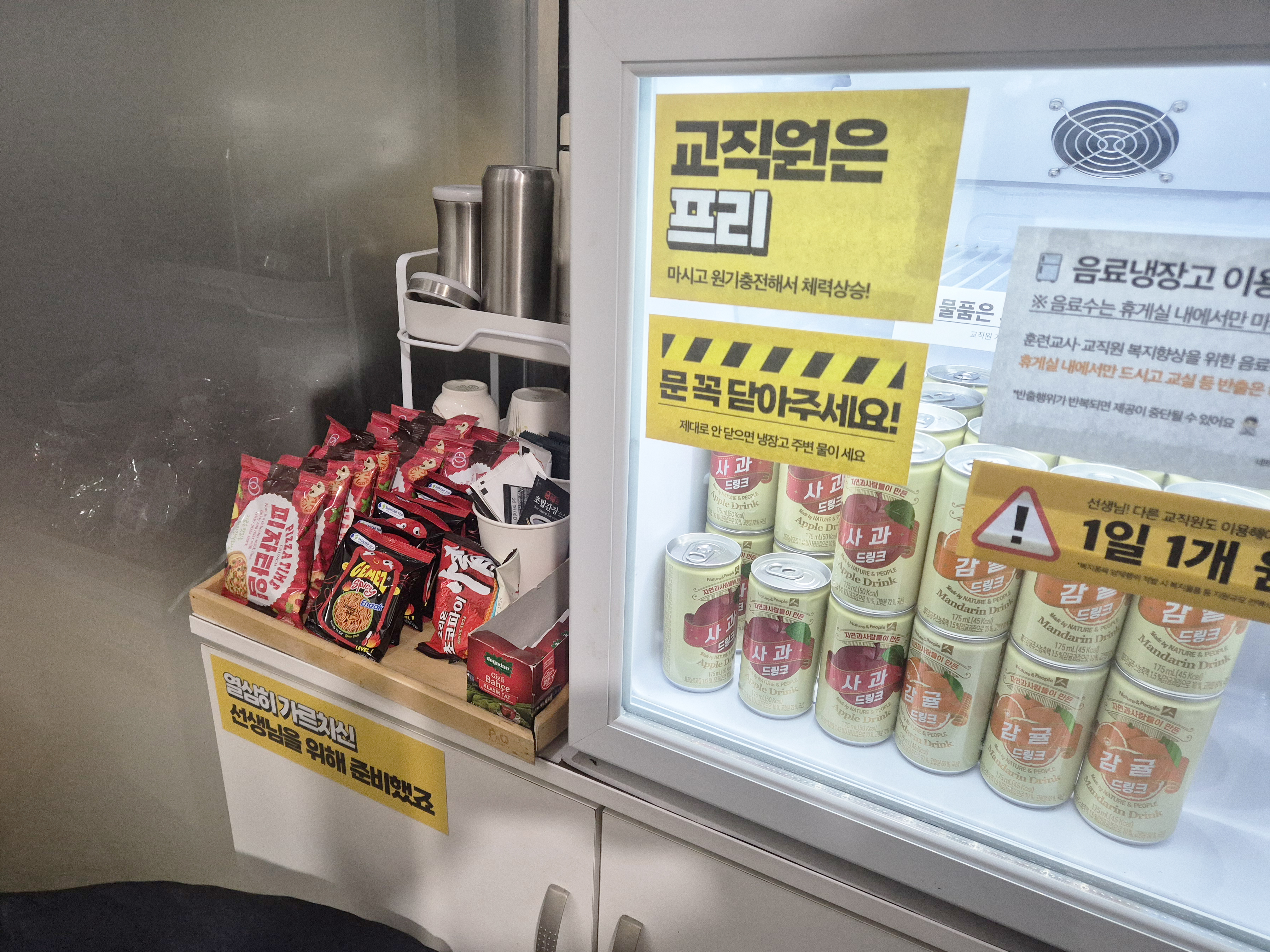 휴게실 냉장고에는 늘 선생님들을 위한 간식이 가득 채워져있어요!