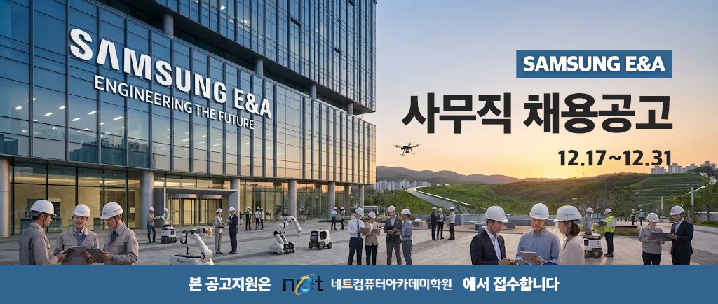 삼성그룹 건설부문 계열사인 (주)SAMSUNG E&A에서 본 원의 수료생을 대상으로 한 사무직을 선발합니다. 본 채용공고와 관련해 우리 아카데미의 재학생 혹은 졸업수료생 여러분의 많은 관심 바랍니다.