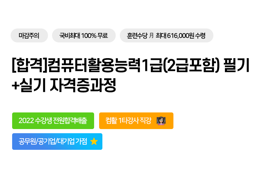 | 교육과정 | [합격]컴퓨터활용능력1급(2급포함)필기+실기자격증 과정 | |||