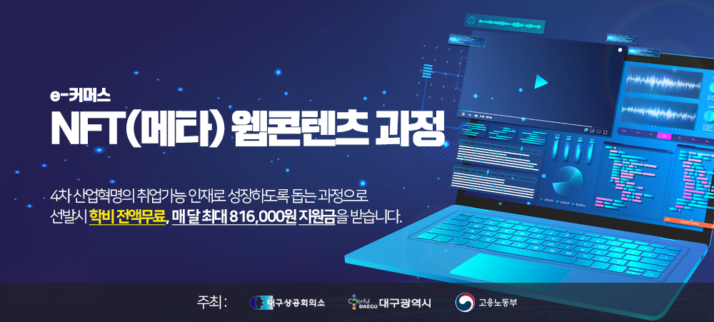 교육센터 소개/공지사항 [소식] 🚨수강료 100% 전액지원🚨 NFT(메타) 웹콘텐츠 과정소개 작성자 : 교무행정팀 작성일 : 2022. 7. 23. 00:45 웹콘텐츠, NFT 관련 언론보도 (좌:연합뉴스, 우:JTBC) ✅ 4차산업혁명의 기술혁신과 발전에 필요한 내용을 배울 수 있는 과정입니다 변화하는 시대 현재 4차산업혁명이라 불리우며 기술혁신과 발전이 이뤄지고 있습니다. 전·현직 지역거점 대학교 교수초빙 수업과 대구상공회의소 지원을 바탕으로 취업 준비생에게 선발시 전원 정부지원 혜택과 월 최대 816,000원의 지원금(훈련장려금)을 받을 수 있습니다. 공유하기 게시글 관리 네트컴퓨터아카데미학원 대구점 목록 [초격차] 예약쿠폰 최대 10% 단독제공! 🎯테마강의 마감주의 👆🏻 바로가기 교육부터 1:1 멘토링+인턴쉽 기회까지😎 지금바로 신청해봐! 티스토리툴바