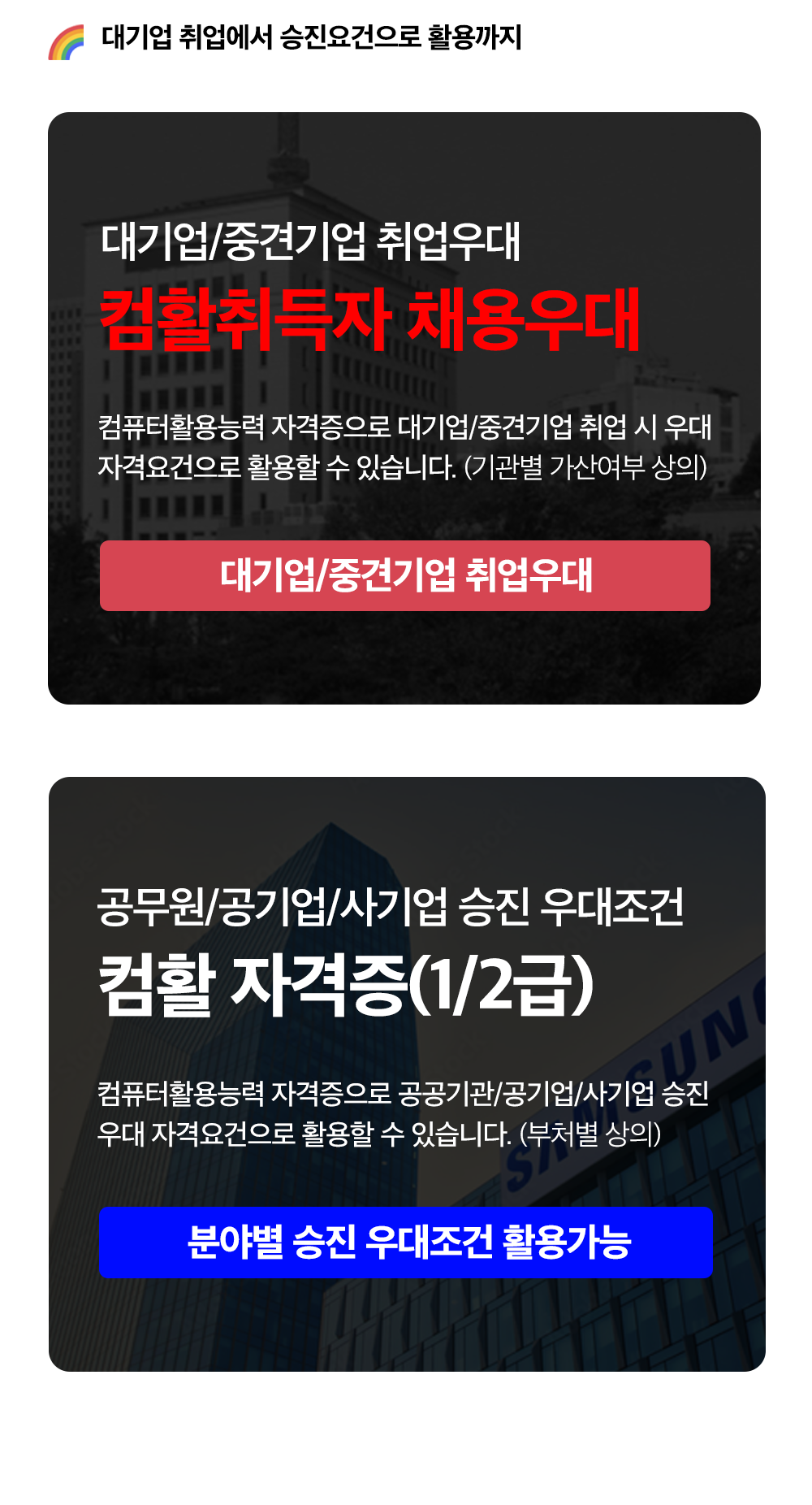 산업계의 정보화가 진전되면서 경영분석, 데이터 관리가 필수화 됨에 따라 제정된 컴퓨터활용능력 자격증은 대기업/중견기업/공공기관/공기업/공무원(소방, 경찰 등) 다양한 직종에서 취업승진 시 가점으로 활용할 수 있습니다.