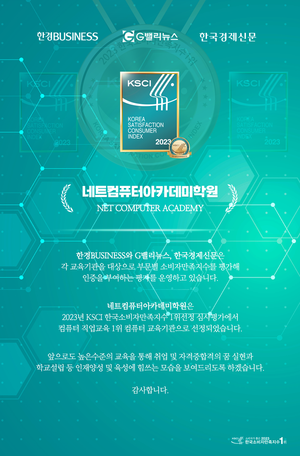 교육센터 소개/공지사항 [소식] 한경BUSINESS KSCI 1위 네트컴퓨터아카데미학원 선정! 작성자 : 교무행정팀 작성일 : 2023. 4. 17. 08:30 ✅ 원클릭 간편 수강신청 희망하시는 과정과 문의내용을 작성해주시면 빠른 수강문의가 가능합니다 공유하기 게시글 관리 네트컴퓨터아카데미학원 대구점 목록 [초격차] 예약쿠폰 최대 10% 단독제공! 🎯테마강의 마감주의 👆🏻 바로가기 교육부터 1:1 멘토링+인턴쉽 기회까지😎 지금바로 신청해봐! 티스토리툴바