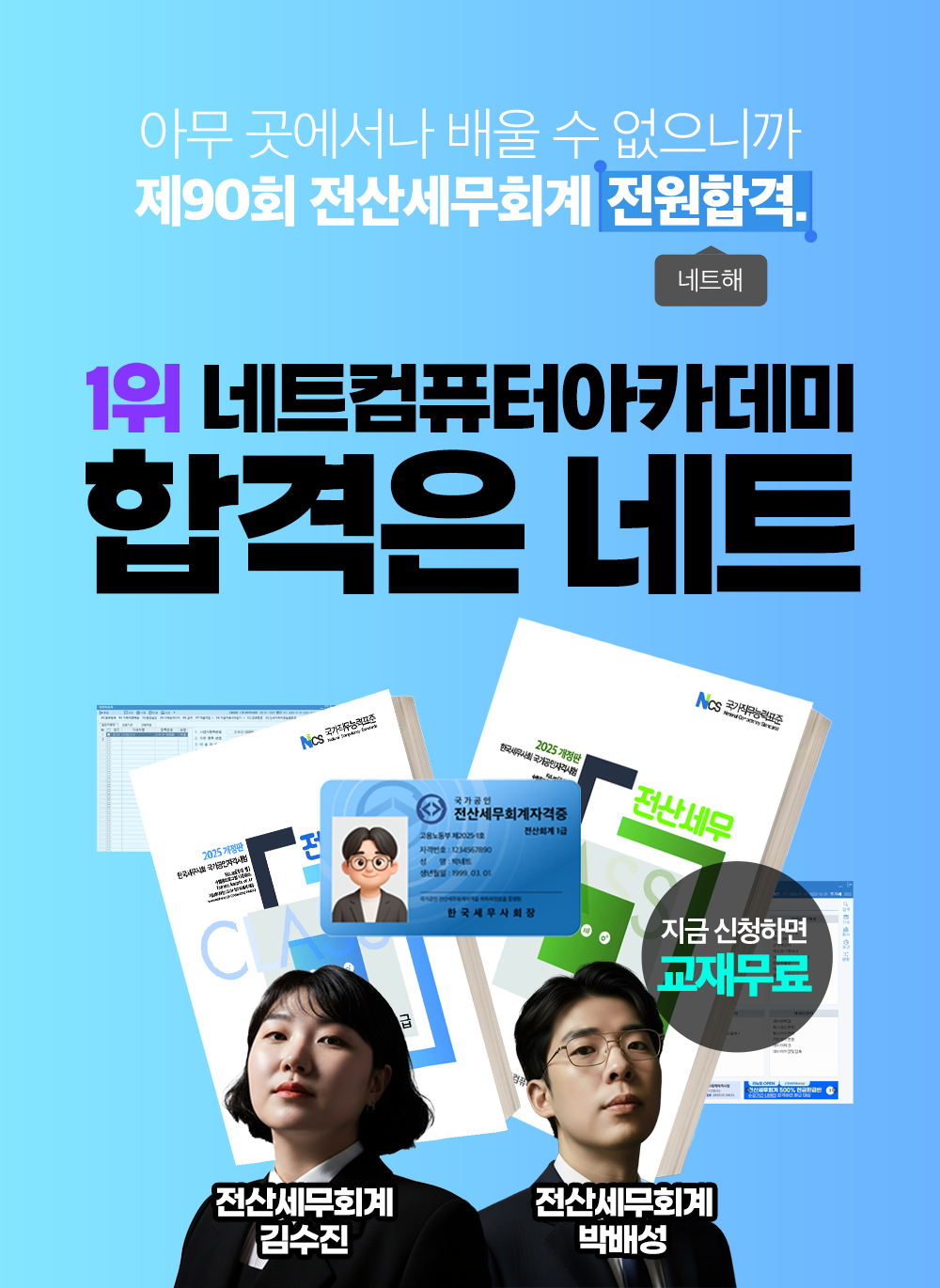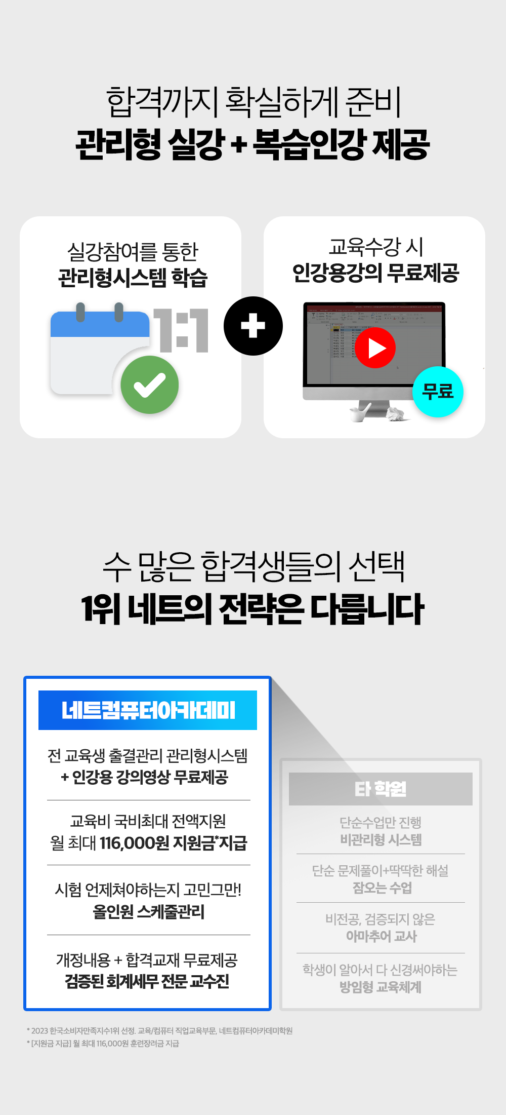 1위 네트만의 관리형시스템으로 합격까지 빠르게 준비하세요! 관리형 1:1 출결관리부터 동영상강의 무료제공, 올인원스케줄 관리로 합격에만 집중할 수 있도록 교육과정을 편성하였습니다.