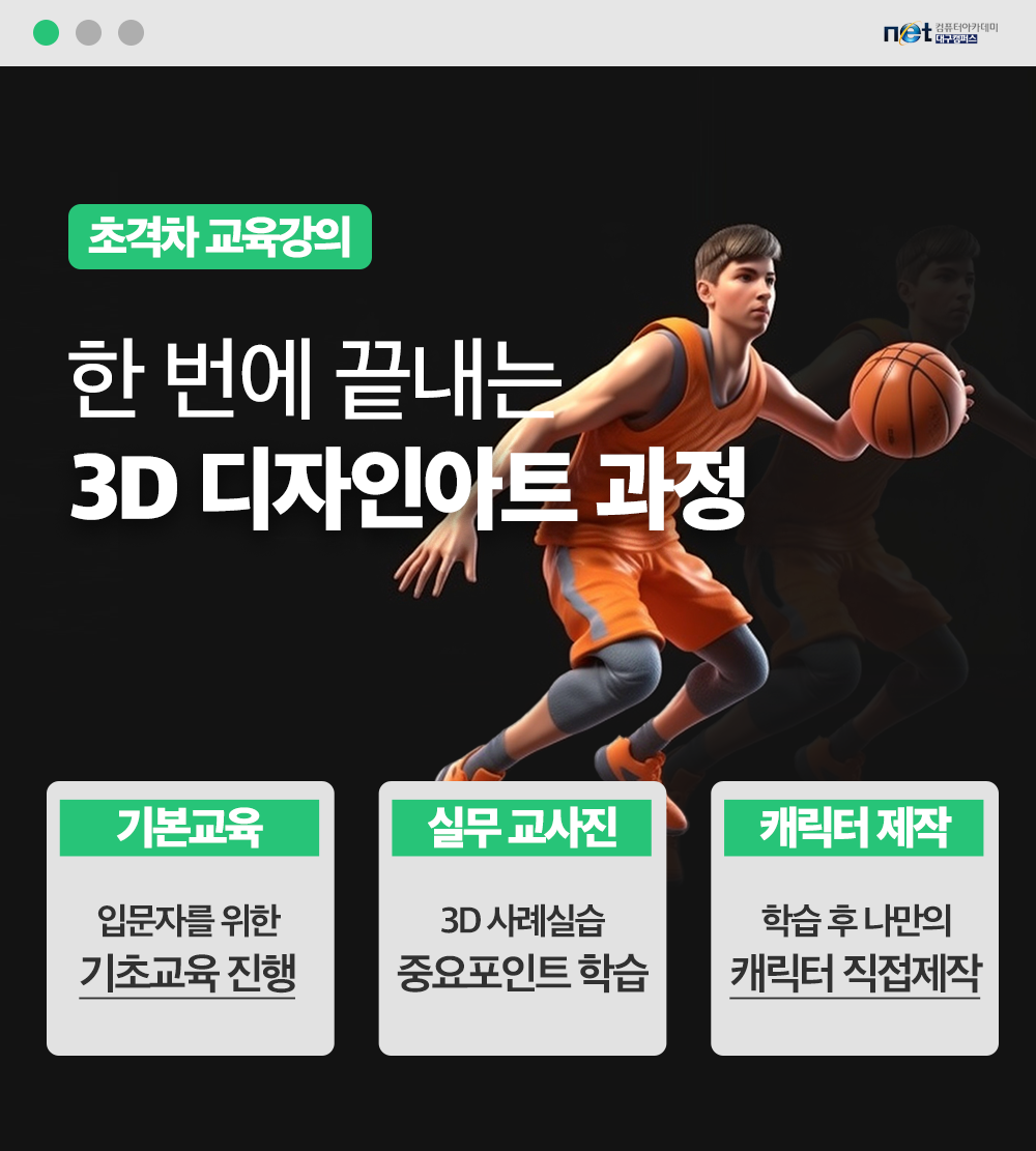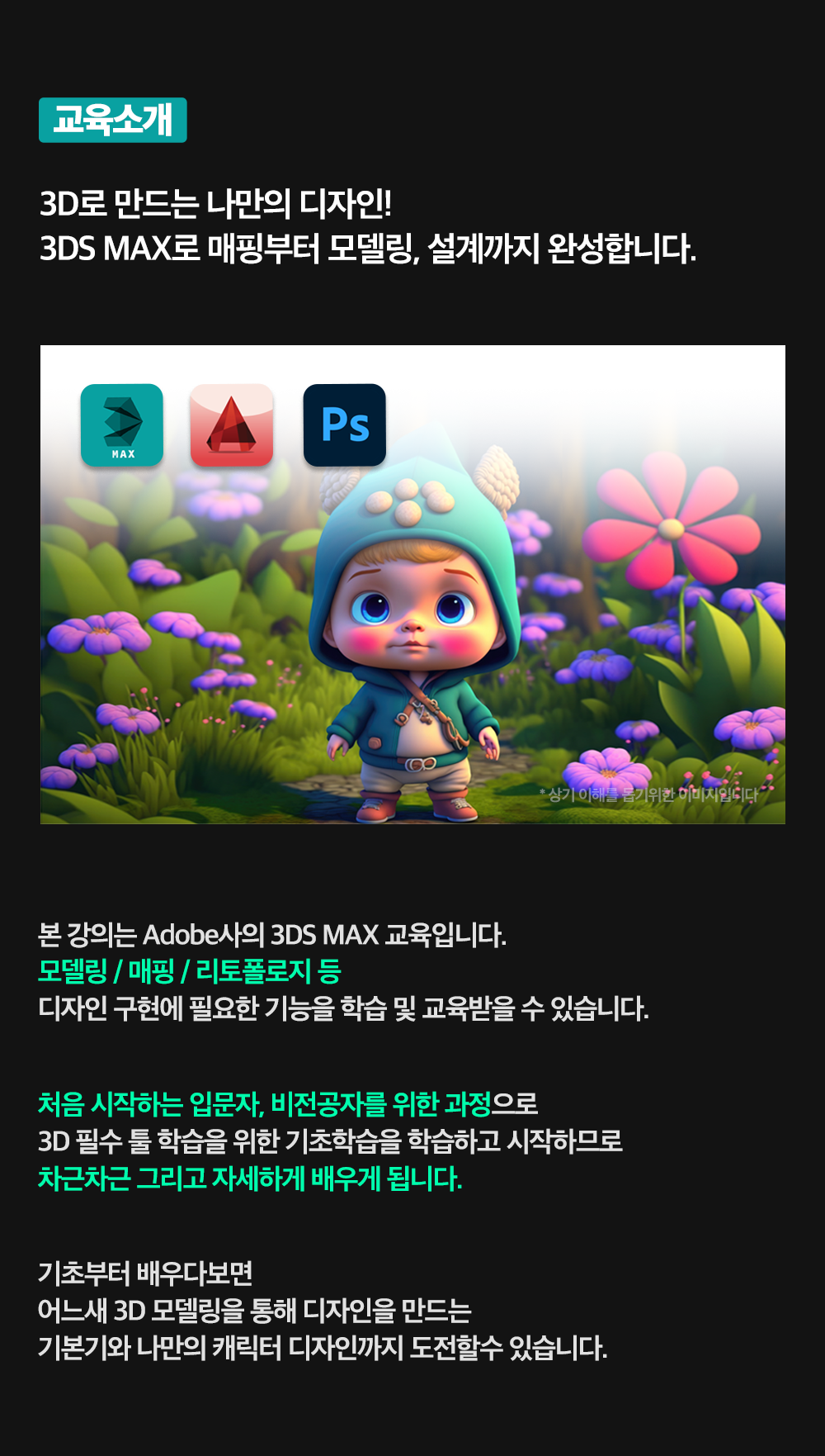 3D를 만들기 위한 방법을 기본입문부터 모델링까지 입문자를 위한 교육과정을 편성하였습니다. 실무자들이 사용하는 다양한 스킬을 배우는데 집중하는 과정으로 핵심내용을 중심으로 확실하게 학습할 수 있는 코스입니다.