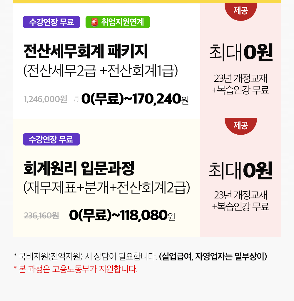 | 회계끝판왕(전산세무2급+전산회계1급+전산회계2급) 합격과정 | 👉🏻 [마감임박] 합격자료 전원 무료! 조기마감 주의 ⭐ |