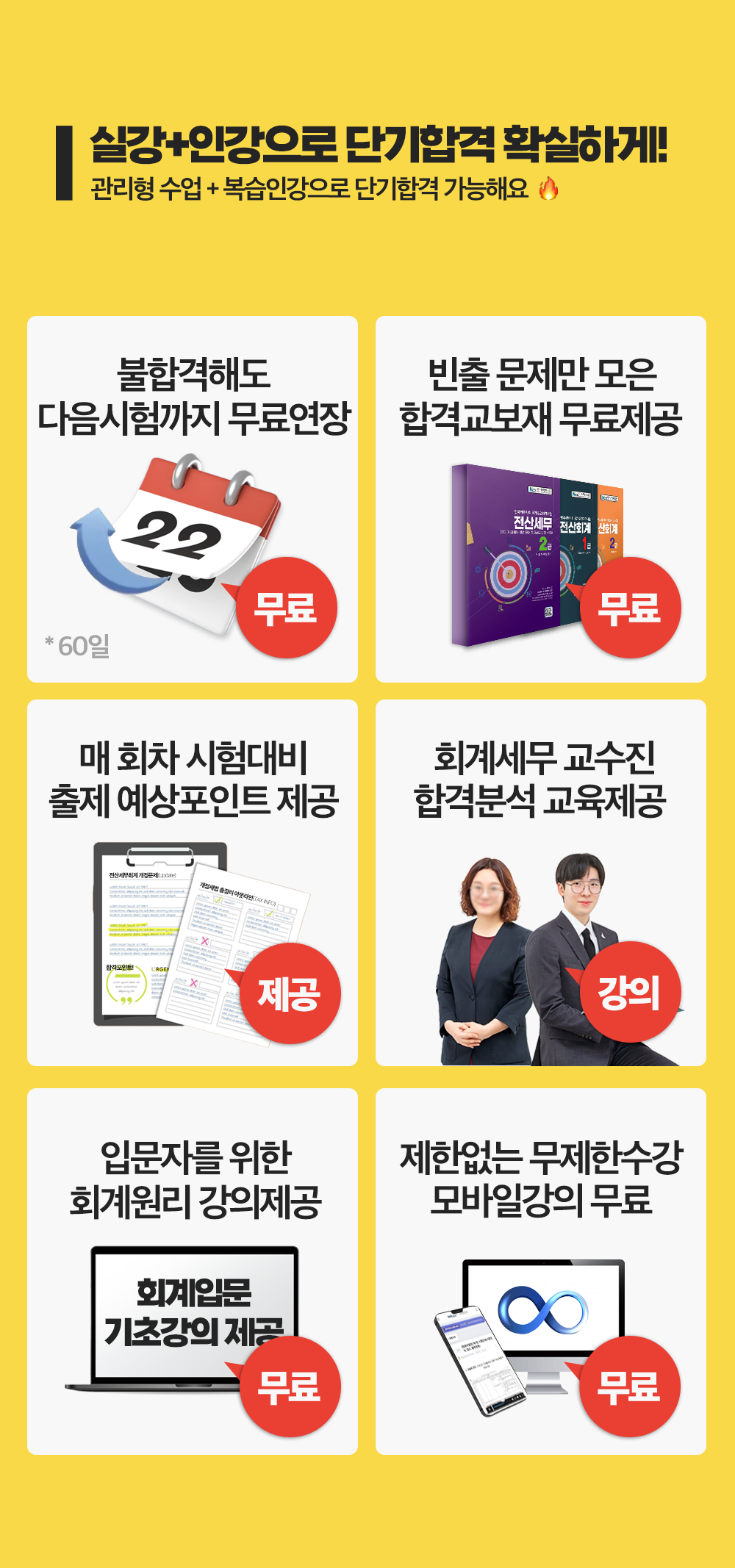 관리형 1:1 출결관리부터 동영상강의 무료제공, 올인원스케줄 관리로 오로지 합격에만 집중할 수 있도록 교육과정을 편성하였습니다. 인강의 장점, 실강의 장점으로 합격을 최대한 빠르게 그리고 확실하게 준비할 수 있습니다.
