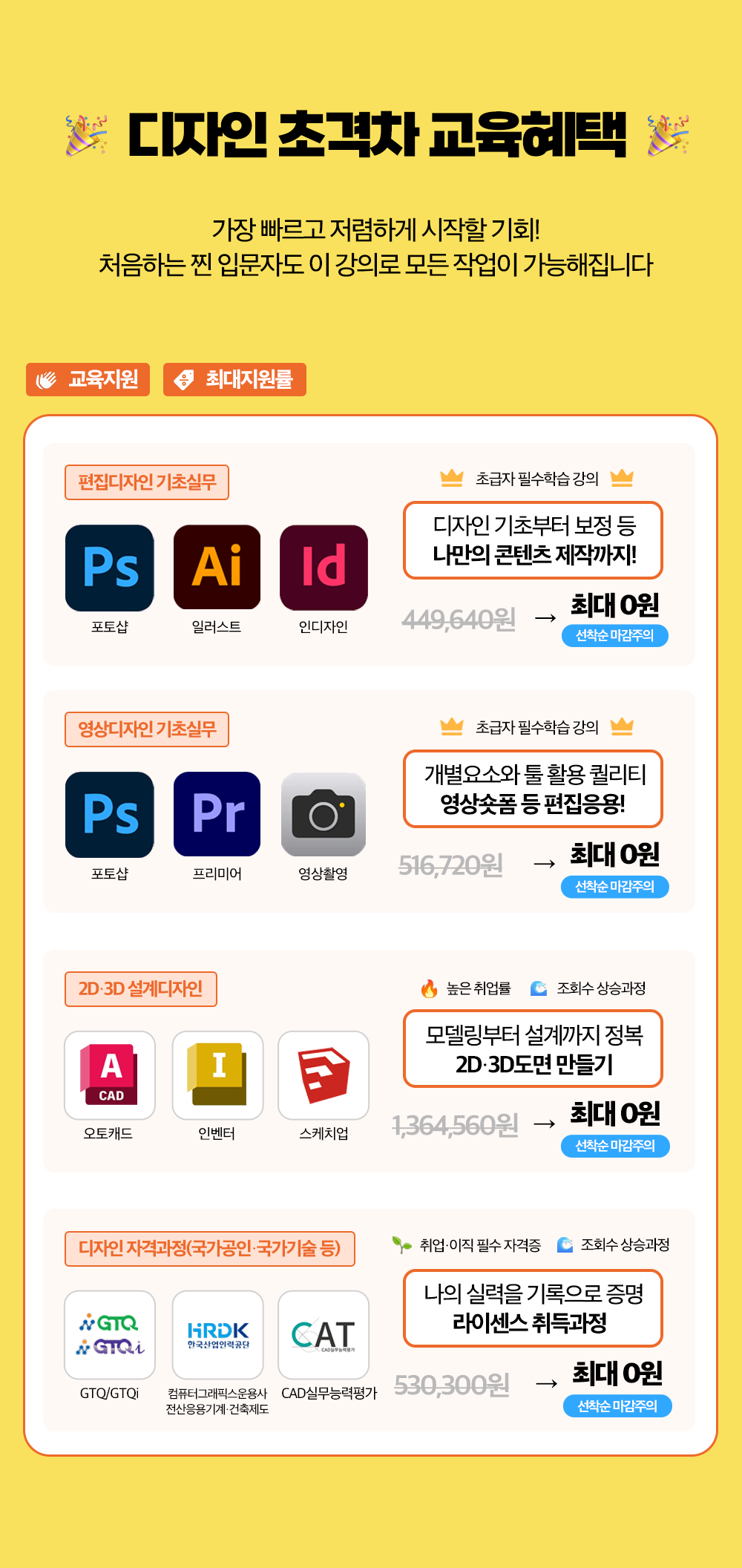 | [디자인 자격과정] 컴퓨터그래픽스 실기+GTQ(포토샵,일러스트,인디자인) (월~금/09:00~14:30) | 3월 27일~ 4월 18일 |