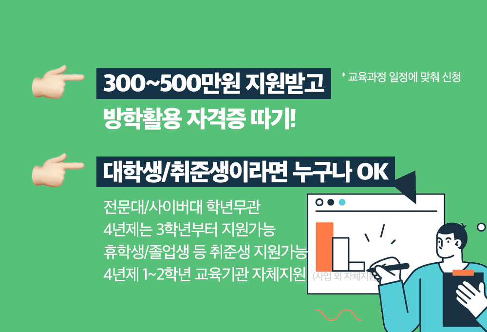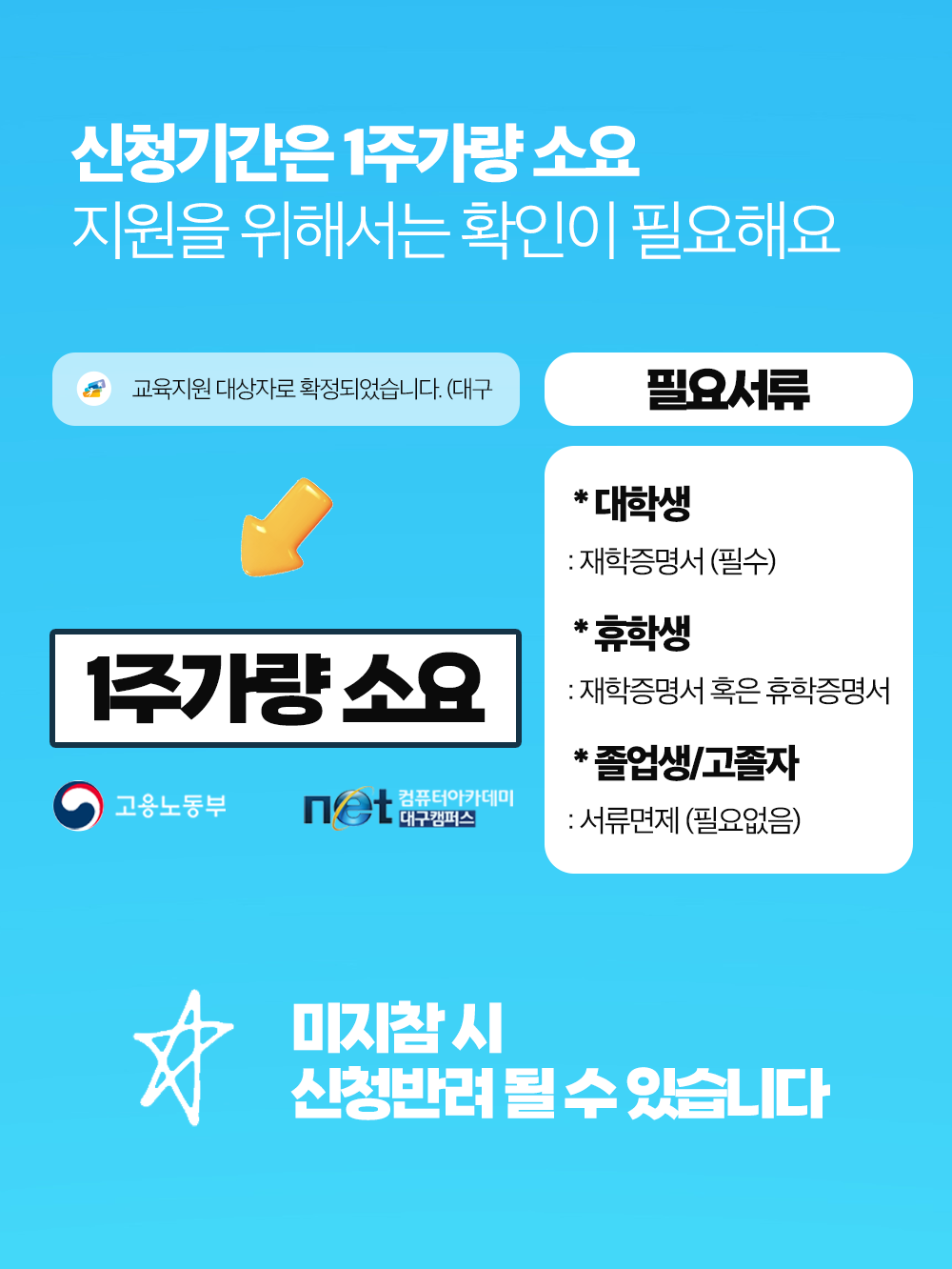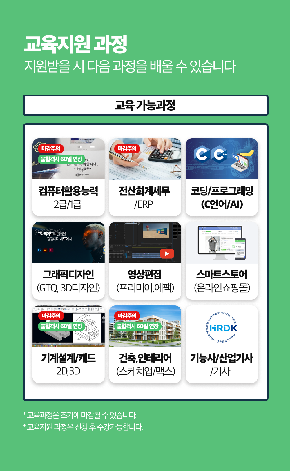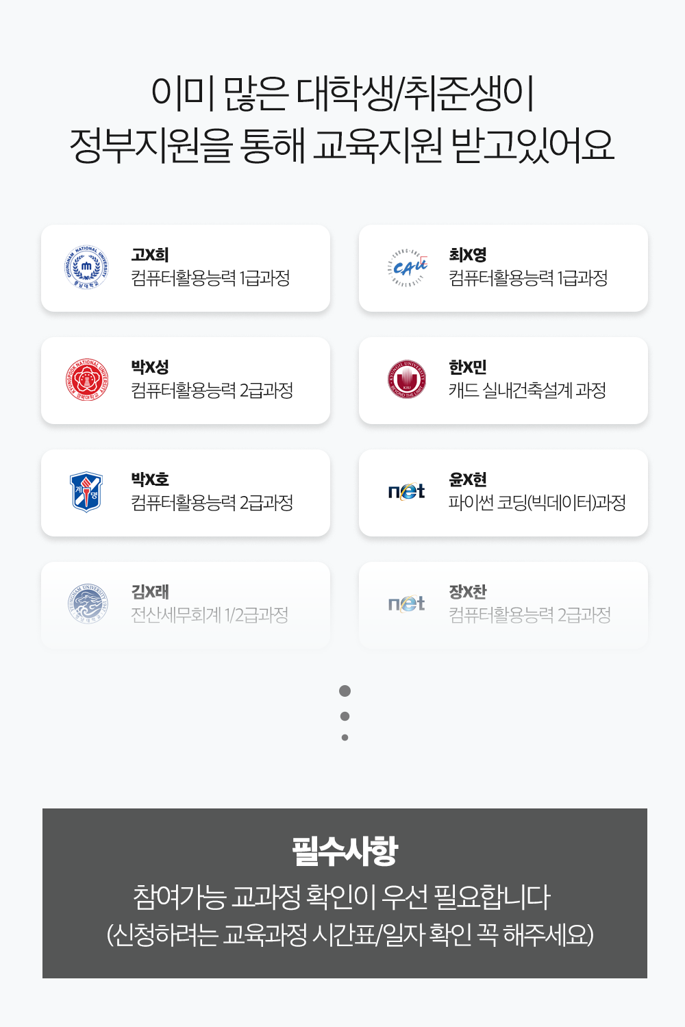 | 🔍 교육지원 대상 상세안내 - 대상자 : 20살 이상의 고졸자, 대학생, 졸업생 - 교육지원 신청 : 교육과정 일정조회 후 신청내방 (필수!) - 특전 : 선발 시 300~500만원 교육지원 혜택 (45~100%) |