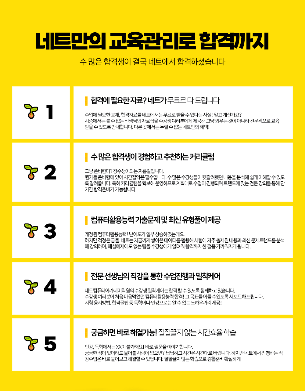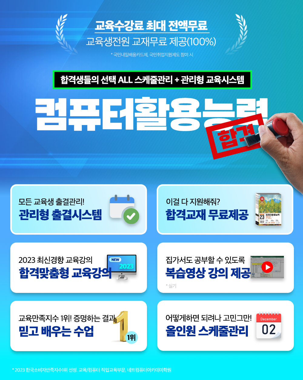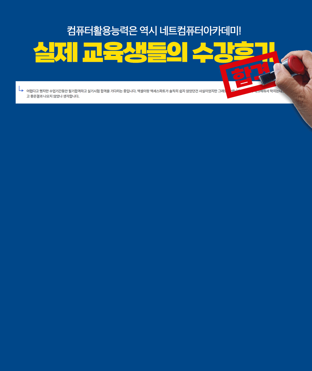 ⏰ 독학이나 인강으로 혼자 연습해도 안되셨던 분, 관리형 수업으로 빠른 기간 내에 합격하기를 희망하시는 분. 네트컴퓨터아카데미에서 실강+인강교육으로 확실한 준비가 가능합니다.