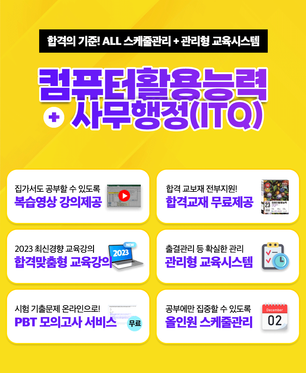 본 과정을 통해 컴퓨터활용능력 2급 자격증과 사무행정 기초 및 실무(+ 정보기술자격/ITQ 자격증)에 필요한 기능들을 다룰 수 있는 취득능력을 단기간에 습득할 수 있습니다. 합격에 필요한 내용을 모두 배울 수 있는 올인원과정으로 출제 기준과 사무실무 능력에 필요한 내용들로 맞추어 구성되었습니다.
