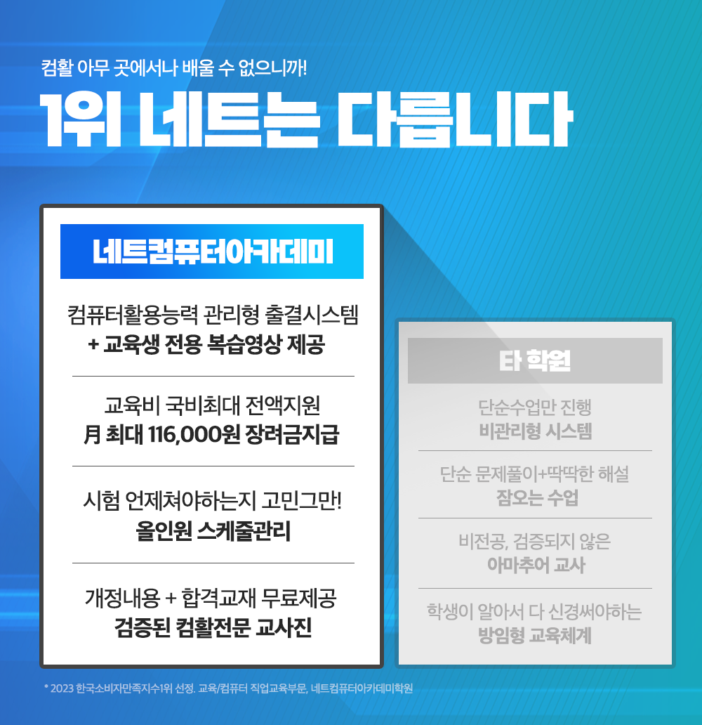 ⏰ 독학이나 인강으로 혼자 연습해도 안되셨던 분, 관리형 수업으로 빠른 기간 내에 합격하기를 희망하시는 분. 네트컴퓨터아카데미에서 실강+인강교육으로 확실한 준비가 가능합니다.