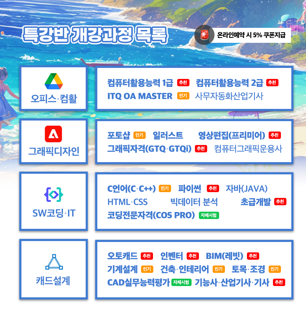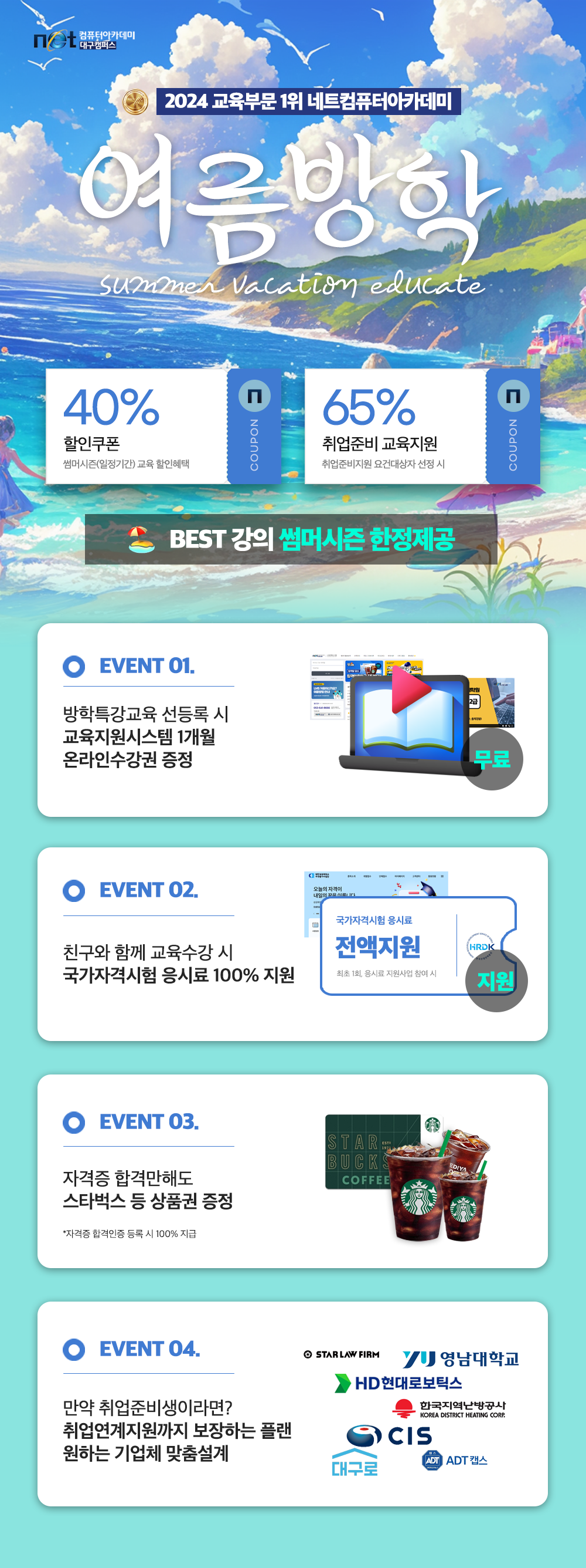 교육기관 안내 교육기관 소개 교육기관장 소개 캠퍼스안내 캠퍼스 주차안내 개강일정 안내 정규 교육과정 국비 교육과정 2024 썸머시즌 여름방학 특강이 오픈했어요🛟 🛟 여름방학 특강교육 알아보시겠어요? 주말·공휴일에도 교육과정 교육신청이 가능해요 완주까지 함께하는 찐한관리, 방학특강 지원받고 합격까지 🏆 공유하기 게시글 관리 네트컴퓨터아카데미학원 대구점 [초격차] 예약쿠폰 최대 10% 단독제공! 🎯테마강의 마감주의 👆🏻 바로가기 교육부터 1:1 멘토링+인턴쉽 기회까지😎 지금바로 신청해봐! 티스토리툴바