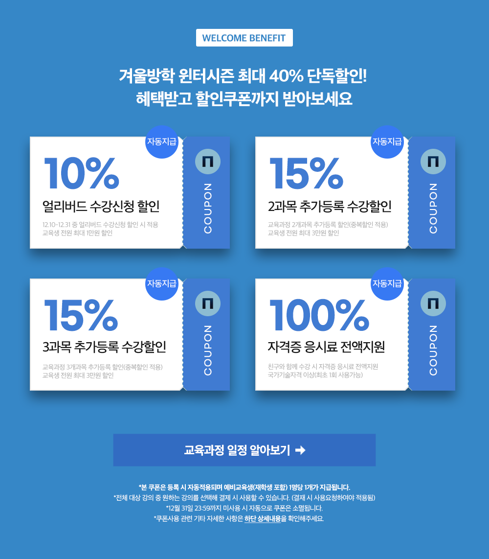 교육기관 안내 교육기관 소개 교육기관장 소개 캠퍼스안내 캠퍼스 주차안내 개강일정 안내 정규 교육과정 국비 교육과정 [1+4 혜택]🎅🏻 겨울방학 윈터시즌 🎅🏻 윈터시즌 과정신청 알아보시겠어요? 주말·공휴일에도 교육과정 수강신청이 가능해요 완주까지 함께하는 찐한관리, 지금 신청하면 최대 40% 교육할인 🚀 공유하기 게시글 관리 네트컴퓨터아카데미학원 대구점 [초격차] 예약쿠폰 최대 10% 단독제공! 🎯테마강의 마감주의 👆🏻 바로가기 교육부터 1:1 멘토링+인턴쉽 기회까지😎 지금바로 신청해봐! 티스토리툴바
